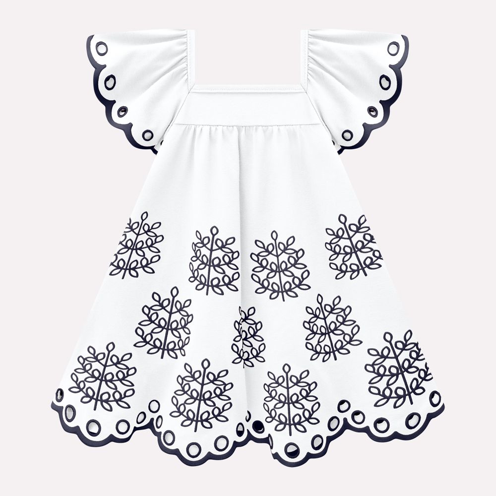 O destaque fica para a estampa localizada de folhas aplicada de forma harmoniosa na barra e nas mangas, combinada ao refinado corte a laser, que cria desenhos delicados e precisos, remetendo a trabalhos artesanais. As mangas curtas com babadinhos estruturados e os franzidos sutis abaixo do busto adicionam volume e movimento, completando o visual com romantismo. Perfeito para ocasiões especiais ou passeios, este vestido traduz a essência da infância com um toque de sofisticação e a qualidade inconfundível da Milon.