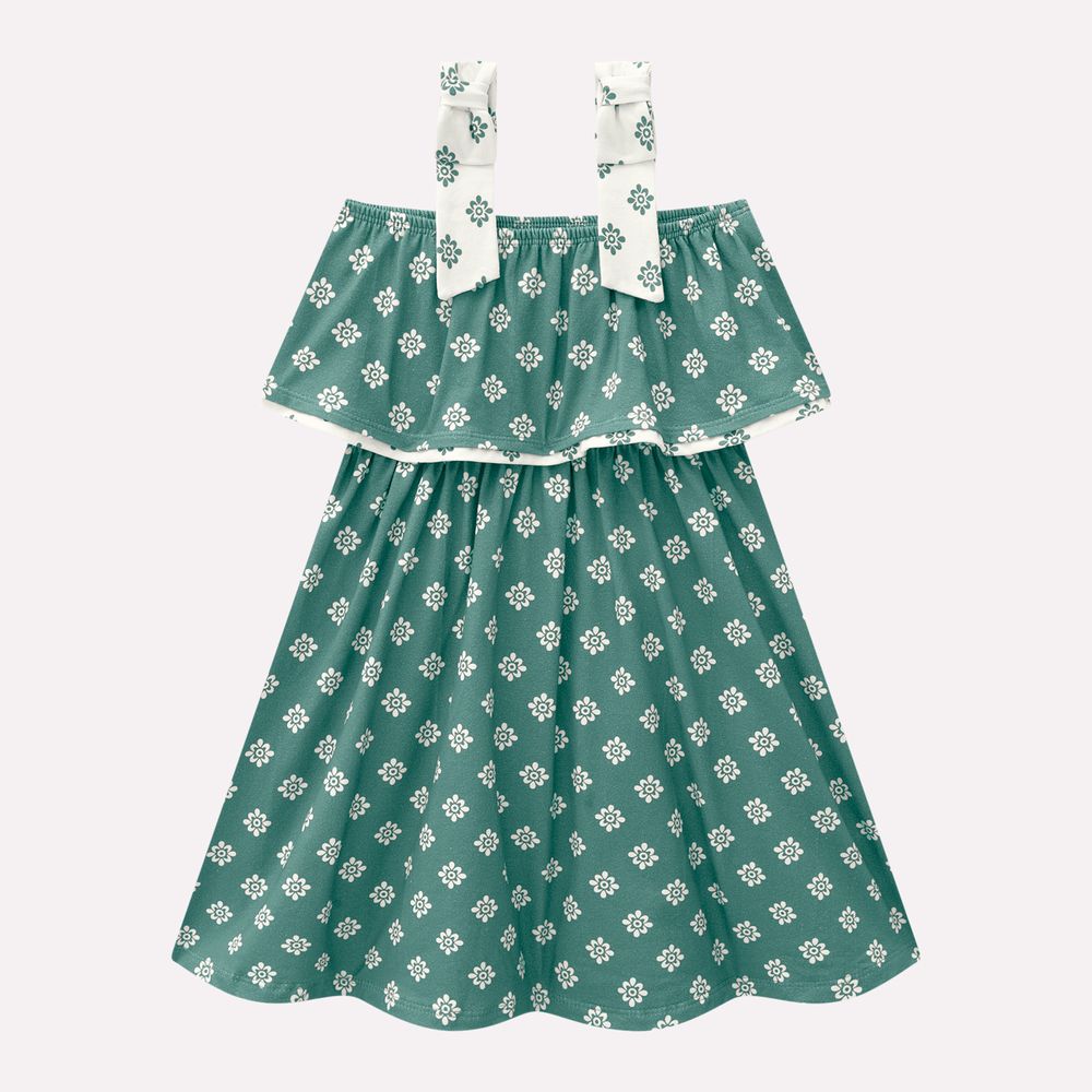 A peça conta com alças largas adornadas por laços, que trazem um toque lúdico e feminino, além de um delicado babado na parte superior que acrescenta movimento e romantismo ao visual. A estampa rotativa de flores em toda a peça cria um efeito harmônico e encantador, reforçando a proposta alegre e leve do modelo. Perfeito para passeios, festas ou momentos especiais, este vestido combina a suavidade do tecido com o cuidado nos acabamentos, entregando um look sofisticado e confortável para a pequena brilhar.