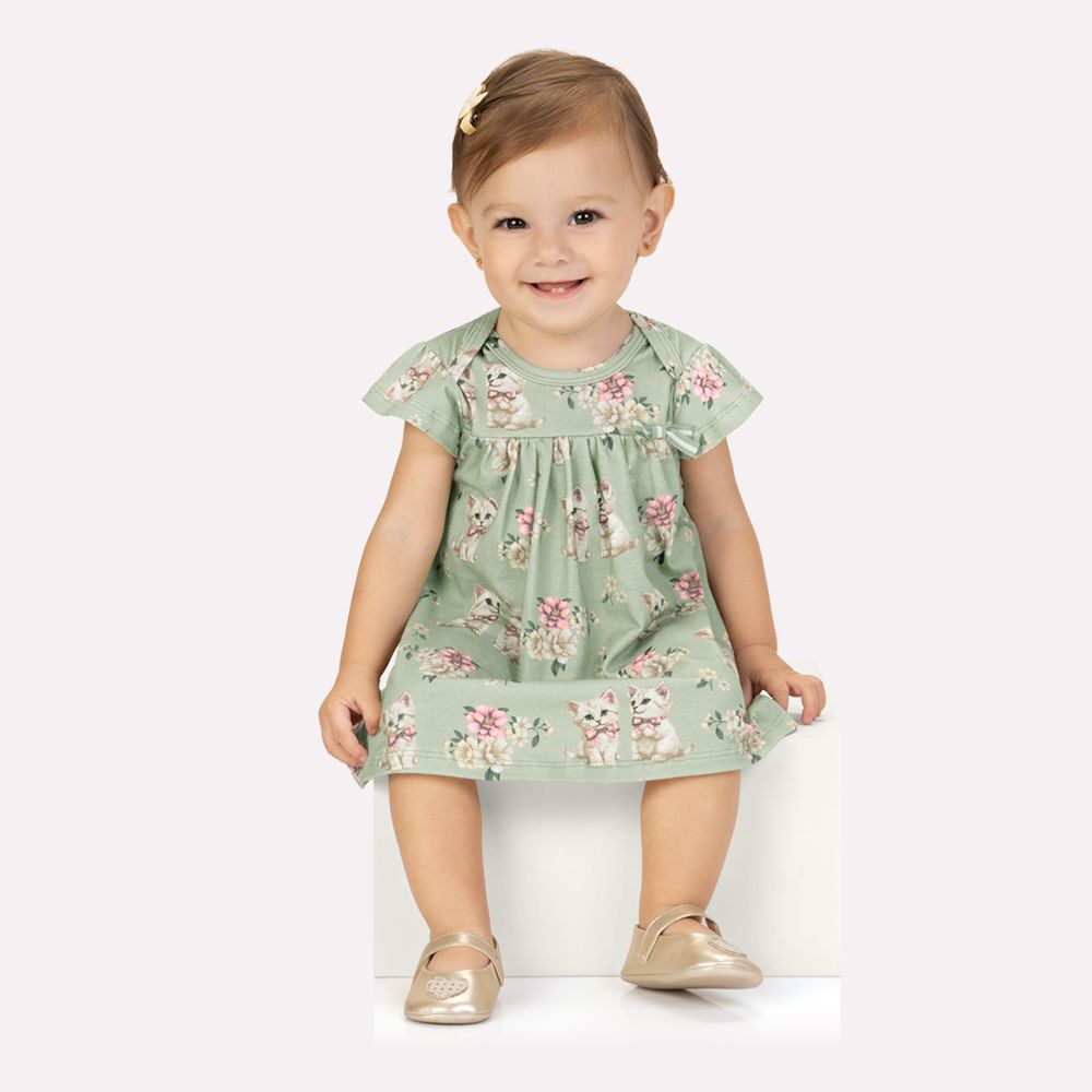 A peça apresenta ainda franzidos suaves abaixo do recorte, criando um caimento leve e soltinho, ideal para acompanhar os movimentos da bebê com liberdade. A estampa rotativa com gatinhos e flores adiciona um toque lúdico e divertido, encantando em cada detalhe. O vestido acompanha entrepernas com fechamento prático, garantindo mais comodidade no dia a dia e facilitando as trocas. Um modelo gracioso e confortável, perfeito para deixar os momentos da bebê ainda mais especiais, combinando o aconchego do algodão com a magia dos bichinhos.